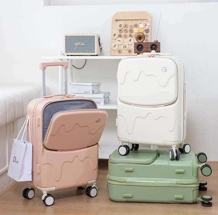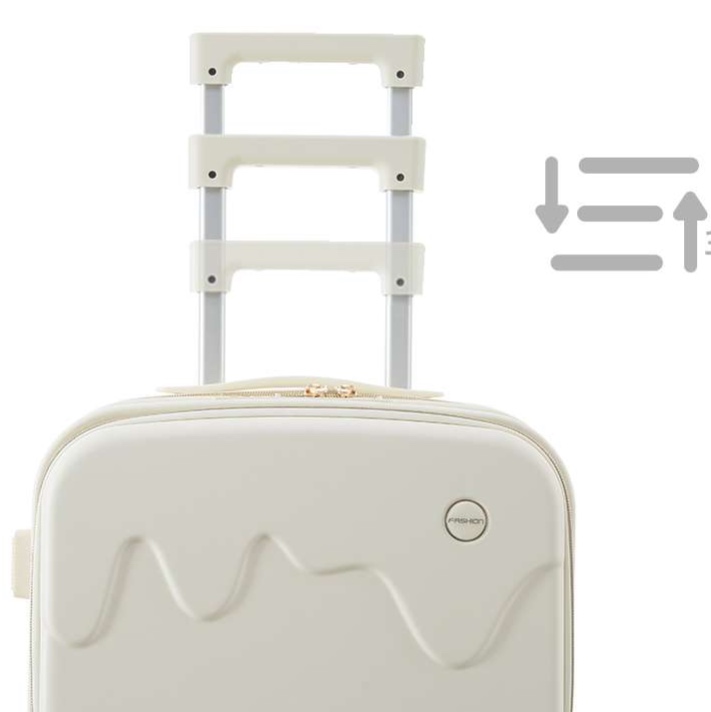 波型デザインが目を引くキャリーケース。スマートフォン充電機能を備え、コーヒーカップホルダーも搭載。スタイリッシュな外観と優れた機能性が融合し、旅行を快適にサポートする頼もしいアイテム。どんな旅にもフィットするデザインで、移動が楽しくなる旅行バッグです。