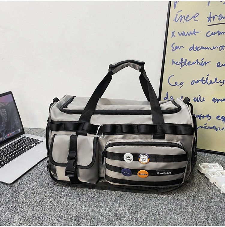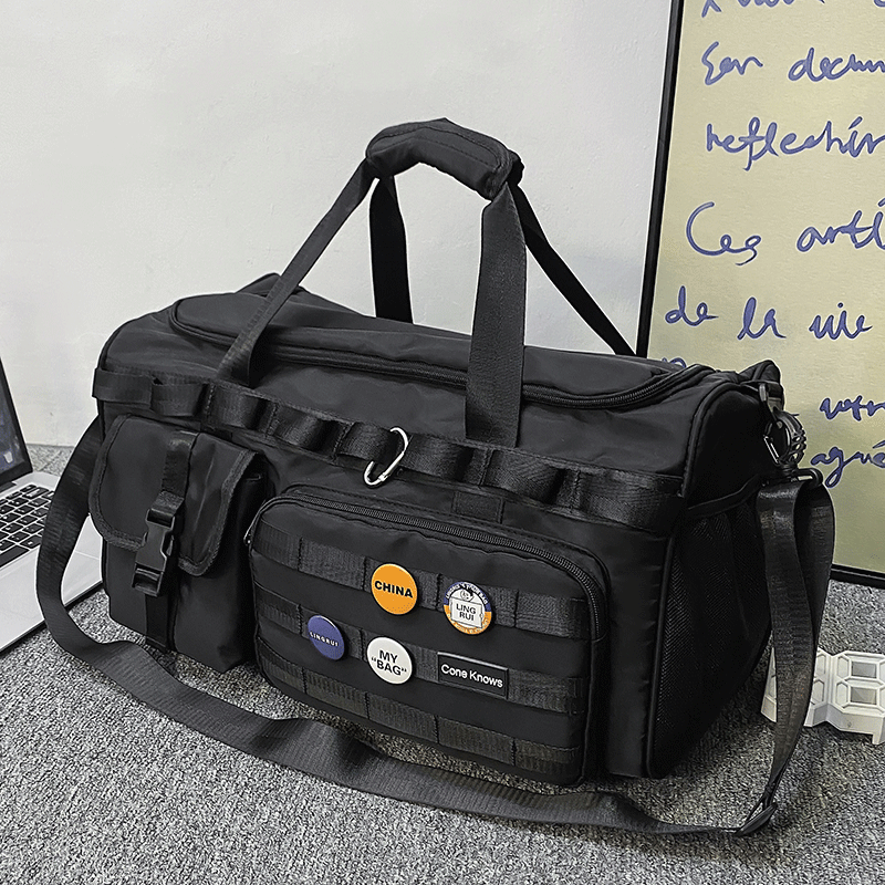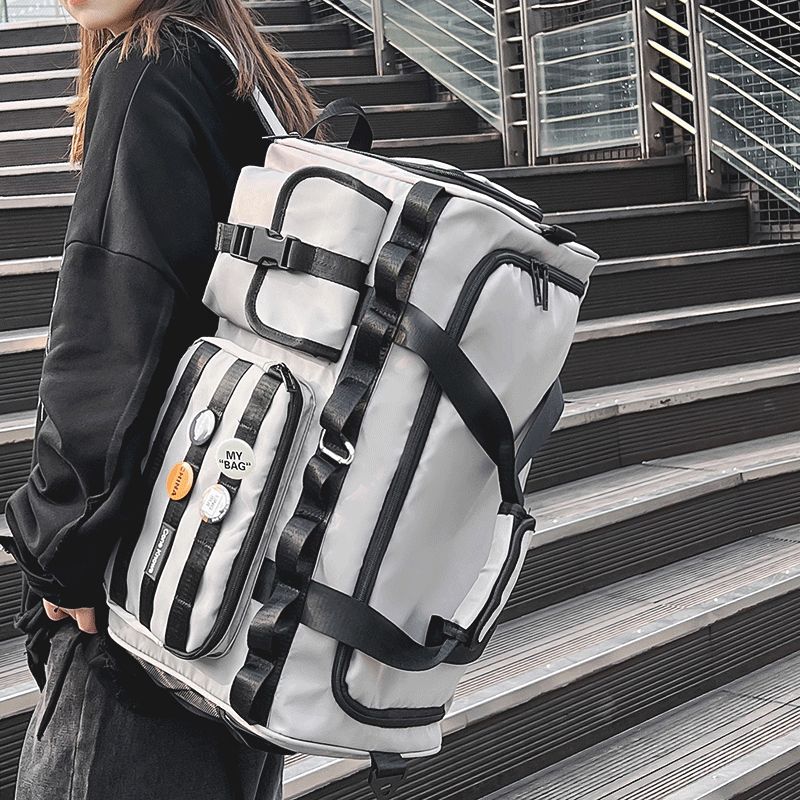 手提げ、肩掛け、背負いの三通りで使える多機能な旅行バッグです。 ボストンバッグとしての収納力はもちろん、リュックスタイルにも変更可能で様々なシーンに対応します。 前面には複数のポケットと調節可能なベルトストラップを配置し、小物の整理や荷物の固定に便利です。 撥水性のある素材を使用し、短期旅行から日常使いまで幅広く活躍する実用的なデザインです。