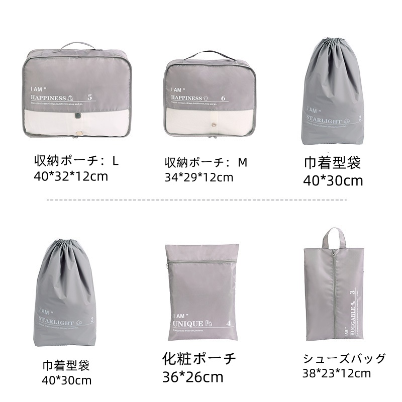 旅行バッグ内をすっきり整理できるトラベルポーチの6点セットです。
